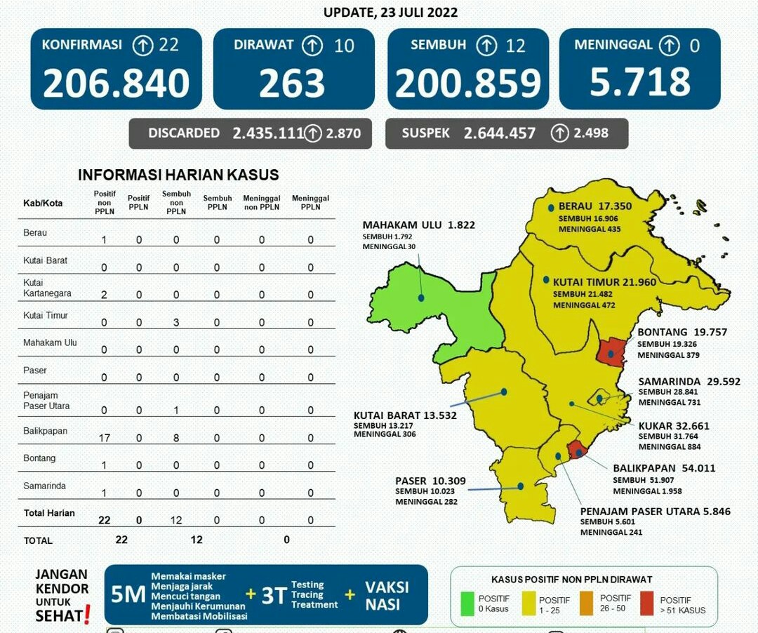 Sementara 7 daerah lainnya masih zonz kuning yakni Kota Samarinda dengan 20 kasus aktif, Kabupaten Berau dan Kutai Barat (Kubar) sama-sama dengan 9 kasus aktif.