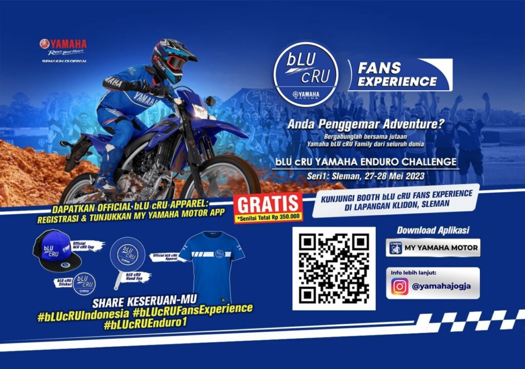 Pada rangkaian event SHELL bLU cRU Yamaha Enduro Challenge di Sleman kali ini juga akan diadakan aktivitas bLU cRU Fans Experience dengan sejumlah agenda menarik yang melibatkan bLU cRU Family (konsumen, komunitas dan fans Yamaha).