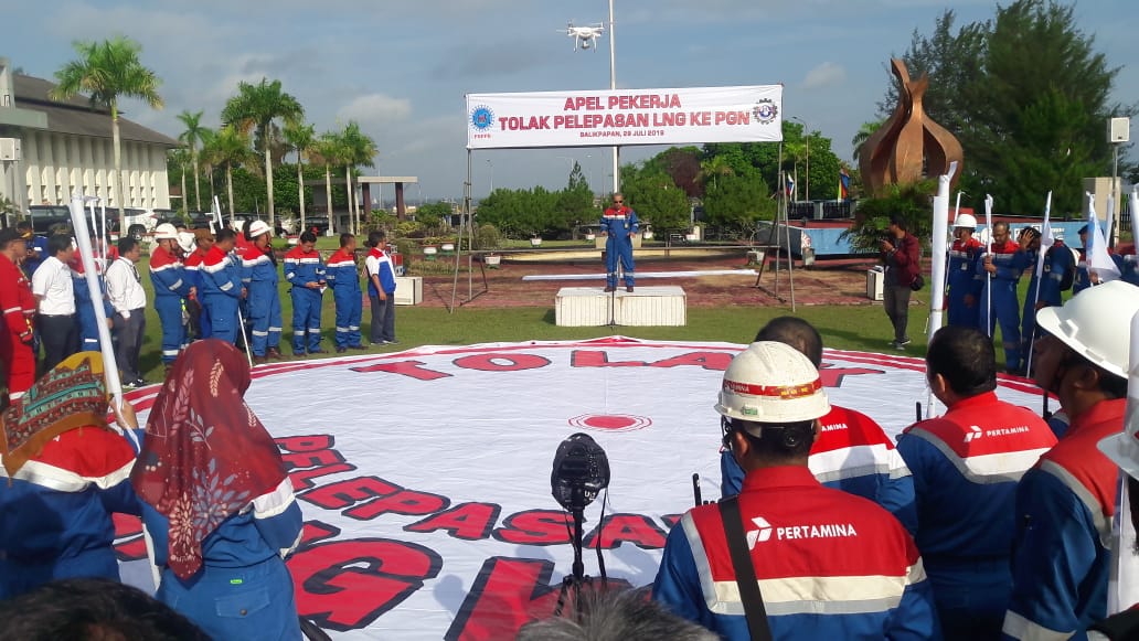 Hal ini mereka sampaikan dalam aksi damai di halaman kantor besar Pertamina Balikpapan Jalan Yos Sudarso, dengan membentang spanduk besar penolakkan atas kebijakan pemerintah pusat, pada Senin pagi (29/7/2019).