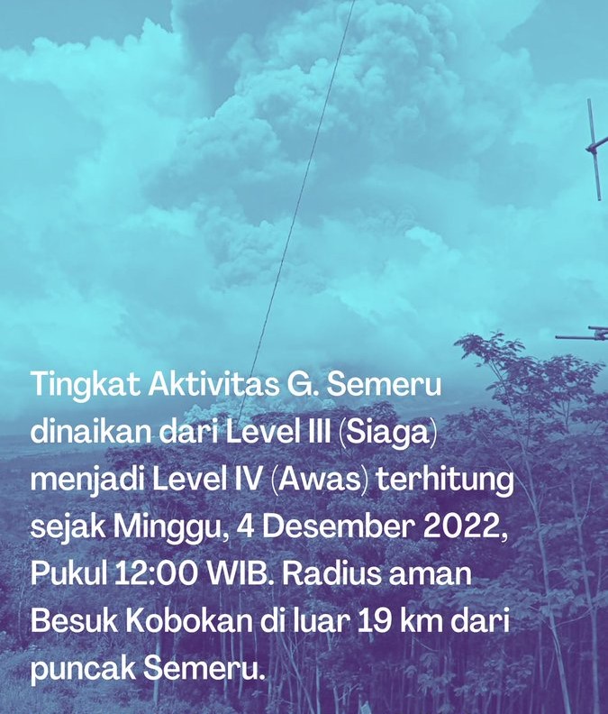 “Status Gunung Semeru dinaikan dari Siaga (level III) menjadi Awas (level IV) terhitung hari Minggu 4 Desember 2022 Pkl 12.00 WIB. Radius aman Besuk Kobokan diluar 19 Kilometer dari puncak Semeru,” demikian dikutip dari akun twitter Pusat Vulkanologi dan Mitigasi Bencana Geologi (PVMBG) Kementerian ESDM