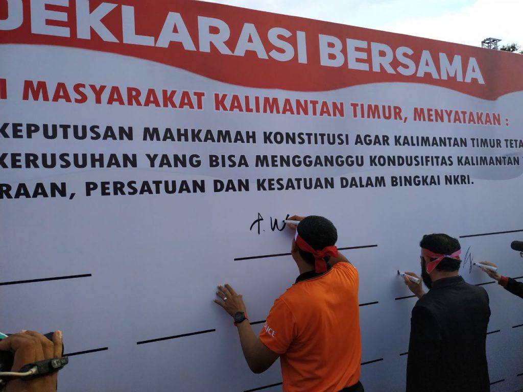 “Satu, Menerima apapun hasil keputusan Mahkamah Konstitusi agar Kalimantan Timur tetap aman dan damai. Dua, menolak segala bentuk kerusuhan yang bisa mengganggu kondusifitas Kalimantan Timur. Tiga, tetap menjaga persaudaraan, persatuan dan kesatuan dalam bingkai NKRI,” katanya membacakan deklarasi diatas panggung kegiatan dihadapan warga Balikpapan.