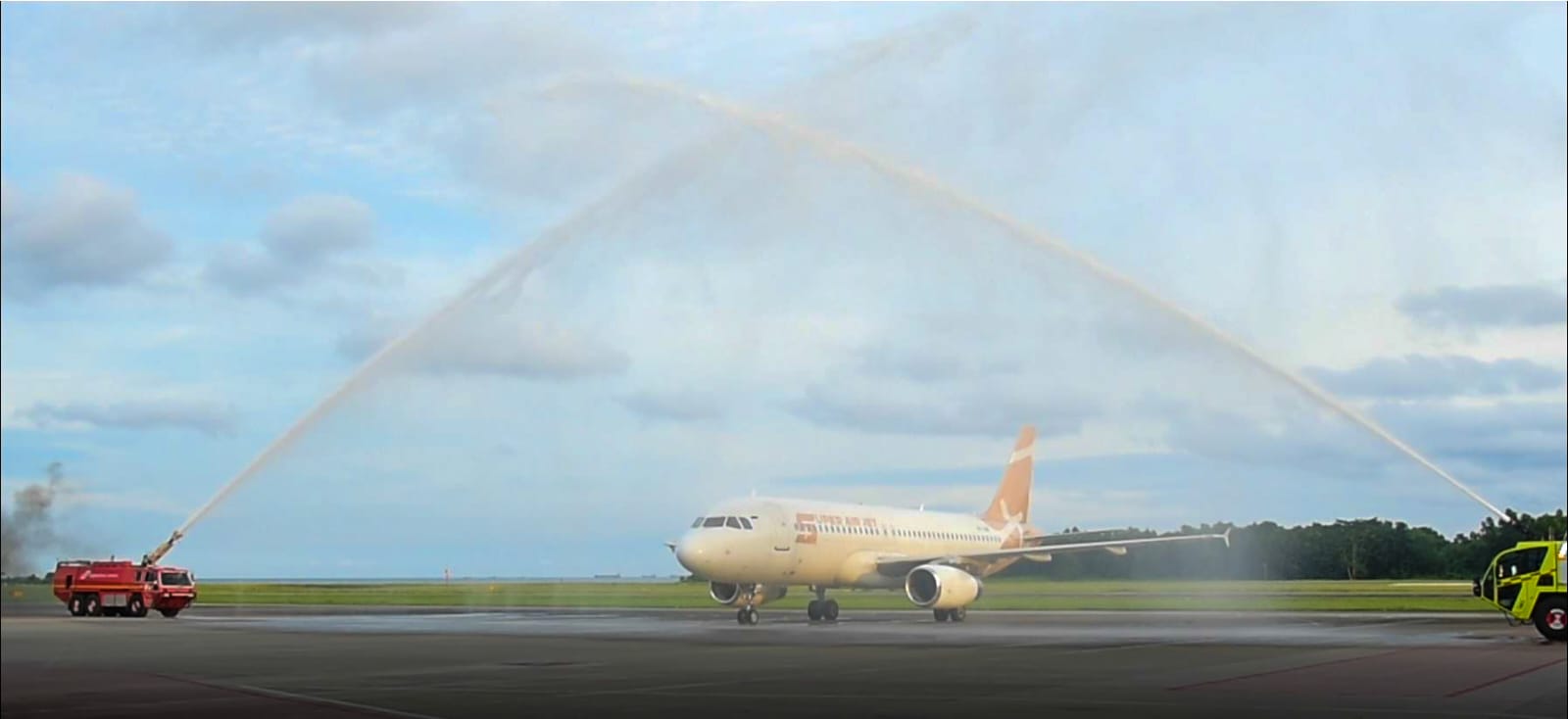 Pesawat Super Air Jet landing di Bandara Sepinggan pada pukul 18.05 Wita dengan nomor penerbangan IU 600 disambut dengan Water Salute oleh dua mobil Airport Rescue & Fire Fighting Bandara Sepinggan.