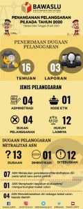 BALIKPAPAN, Inibalikpapan.com – Bawaslu Kaltim merilis dugaan pelanggaran pilkada 2020. Dalam info grafisnya di website kaltim.bawaslu.go.id terdapat 19 kasus yang terdiri dari 16 hasil temuan dan 3 laporan. Adapun jenis pelanggarannya masing-masing yakni 4 kasus administrasi, 1 kasus kode etik. Namun 4 kasus bukan pelanggaran dan 14 kasus hukum lainnya. Kemudian dugaan pelanggaran netralitas Aparatur […]