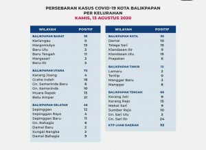 BALIKPAPAN, Inibalikpapan.com – Gugus Tugas Covid-19 Kota Balikpapan merilis jumlah kasus covid-19 berdasarkan kecamatan hingga kelurahan hari ini Kamis (13/08). Kecamatan Balikpapan Utara masih yang tertinggi jumlah kasus positif dengan 72 kasus. Kemudian Kecamatan Balikpapan Tengah dengan 66 kasus positif, Kecamatan Balikpapan Kota dengan 55 kasus positif, Kecamatan Balikpapan Selatan dengan 46 kasus positif, Kecamatan […]