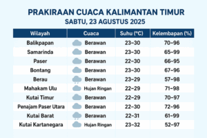 BALIKPAPAN, Inibalikpapan.com – Badan Meteorologi, Klimatologi, dan Geofisika (BMKG) merilis prakiraan cuaca untuk wilayah Kalimantan Timur (Kaltim) pada Sabtu, 23 Agustus 2025. Sebagian besar daerah diprediksi berawan dengan suhu relatif sejuk, namun dua wilayah tercatat berpotensi diguyur hujan ringan. Berdasarkan data BMKG, delapan daerah di Kaltim, yakni Balikpapan, Samarinda, Paser, Bontang, Berau, Mahakam Ulu, Kutai […]