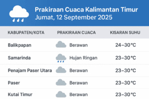 BALIKPAPAN, Inibalikpapan.com – Badan Meteorologi, Klimatologi, dan Geofisika (BMKG) merilis prakiraan cuaca untuk wilayah Kaltim pada Jumat, 12 September 2025. Sejumlah daerah diperkirakan berawan hingga hujan ringan, sementara sebagian wilayah mendapat peringatan dini potensi hujan lebat disertai petir dan angin kencang. Menurut BMKG, Balikpapan diperkirakan berawan sepanjang hari dengan potensi hujan ringan di beberapa kecamatan, […]