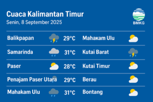 BALIKPAPAN, Inibalikpapan.com – Badan Meteorologi, Klimatologi, dan Geofisika (BMKG) memprakirakan cuaca di Kalimantan Timur pada Selasa, 16 September 2025, didominasi hujan ringan dan berawan di hampir seluruh kabupaten/kota. Kondisi ini perlu diwaspadai masyarakat yang beraktivitas di luar ruangan, terutama pada pagi hingga siang hari. Balikpapan – Samarinda Di Balikpapan, hujan ringan diperkirakan terjadi sepanjang hari […]