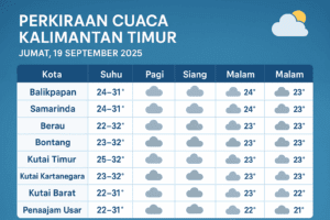 BALIKPAPAN, Inibalikpapan.com – Badan Meteorologi, Klimatologi, dan Geofisika (BMKG) merilis prakiraan cuaca untuk Kaltim pada Jumat, 19 September 2025. Secara umum, cuaca di 10 kabupaten/kota akan didominasi kondisi berawan, namun sejumlah wilayah berpotensi diguyur hujan ringan hingga sedang. Berikut prakiraan cuaca lengkap: BMKG mengingatkan agar masyarakat tetap waspada terhadap potensi hujan yang dapat terjadi terutama […]