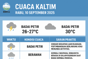 SAMARINDA, Inibalikpapan.com – Badan Meteorologi, Klimatologi, dan Geofisika (BMKG) memperkirakan cuaca di Kaltim pada Rabu (10/9/2025) didominasi kondisi berawan dengan potensi hujan disertai petir pada pagi hingga siang hari di beberapa wilayah. Di Samarinda, cuaca diperkirakan berawan sejak dini hari hingga pagi. Namun, mulai pukul 08.00–09.00 WITA berpotensi terjadi badai petir dengan suhu berkisar 26–27 […]