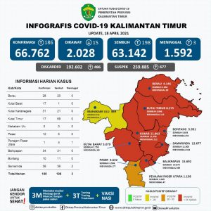 Update 18 April 2021 : Bertambah 186 kasus Kasus Covid-19 di Kaltim, 3 Kasus Kematian