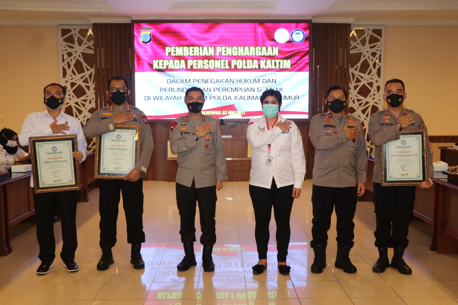 BALIKPAPAN- Kapolda Kaltim Irjen Pol Drs Herry Rudolf Nahak, M.Si., Dirreskrimum Polda Kaltim Kombes Pol Subandi, S.I.K., Kapolresta Balikpapan Kombes Pol Turmudi, S.I.K., dan Kapolres Bontang Akbp Hanifa Martunas Siringoringo, S.I.K., menerima penghargaan dari Tim Reaksi Cepat Perlindungan Perempuan dan Anak (TRC PPA) dan Komisi Nasional Perlindungan Anak (Komnas PA) di Ruang Rupatama Mapolda Kaltim, Rabu (02/06/2021).