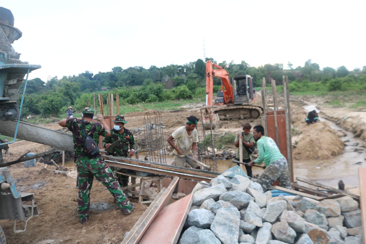 Terlihat personil satgas TMMD siap cor kaki tiang penyangga jembatan,Sabtu(03/10/2020).Selaku Dansatgas TMMD, Letkol Inf Eko Antoni Chandra Lestianto mengatakan bahwa sampai dengan hari ini personil Satgas TMMD dilapangan terus bekerja dengan maksimal agar menyelesaikan target sebelum kegiatan TMMD ini di tutup.