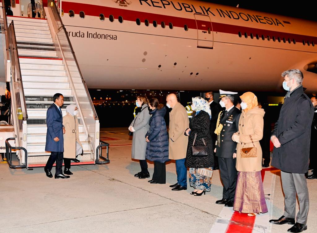 Setelah menempuh penerbangan sekitar 15 jam dari Tanah Air, pesawat Garuda Indonesia GIA-1 yang membawa Presiden dan delegasi tiba di Bandara Abelag, Brussels sekitar pukul 18.00 waktu setempat, Selasa, 13 Desember 2022.