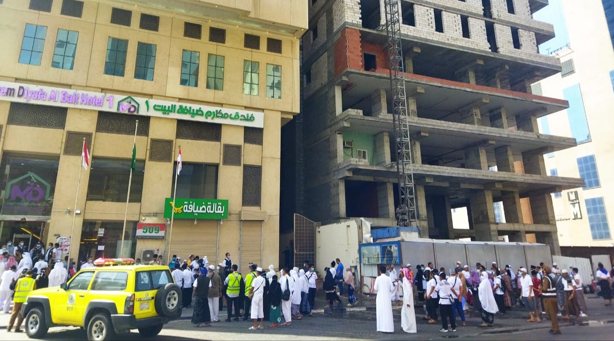 Di lokasi, terlihat petugas pemadam dan ratusan jemaah keluar dari hotel dan berkumpul di sekitar trotoar jalan depan hotel.