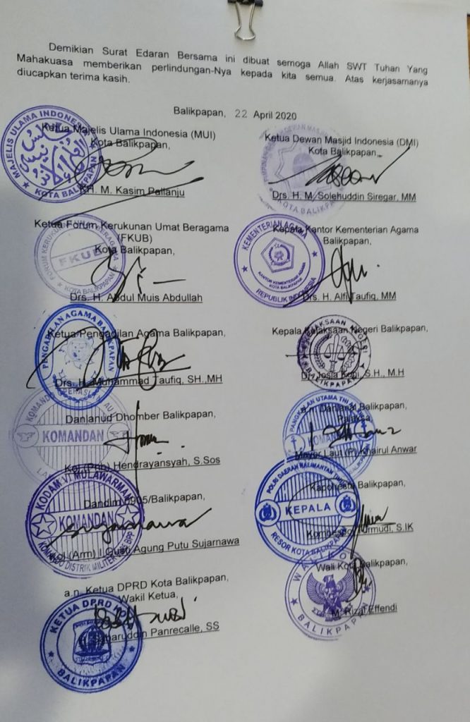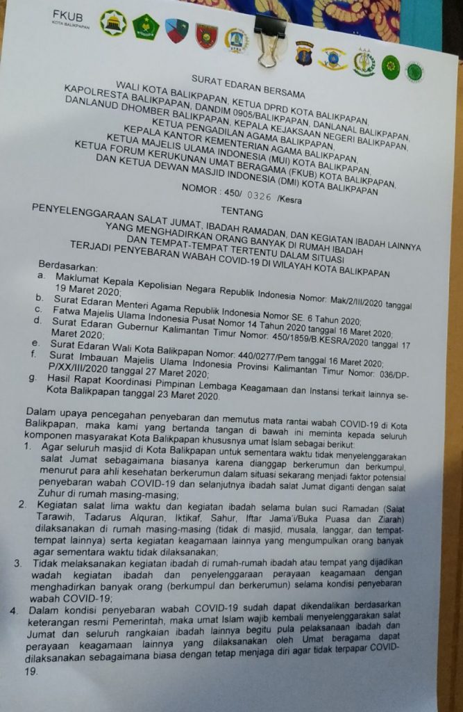 BALIKPAPAN, Inibalikpapan.com — Sejak dikeluarkan surat edaran bersama pada 22 April lalu mengenai pelaksanaan kegiatan beribadah dilaksanakan di rumah, sejumlah rumah ibadah masih melakukan kegiatan salat berjamaah, salat jumat dan salat tarawih.