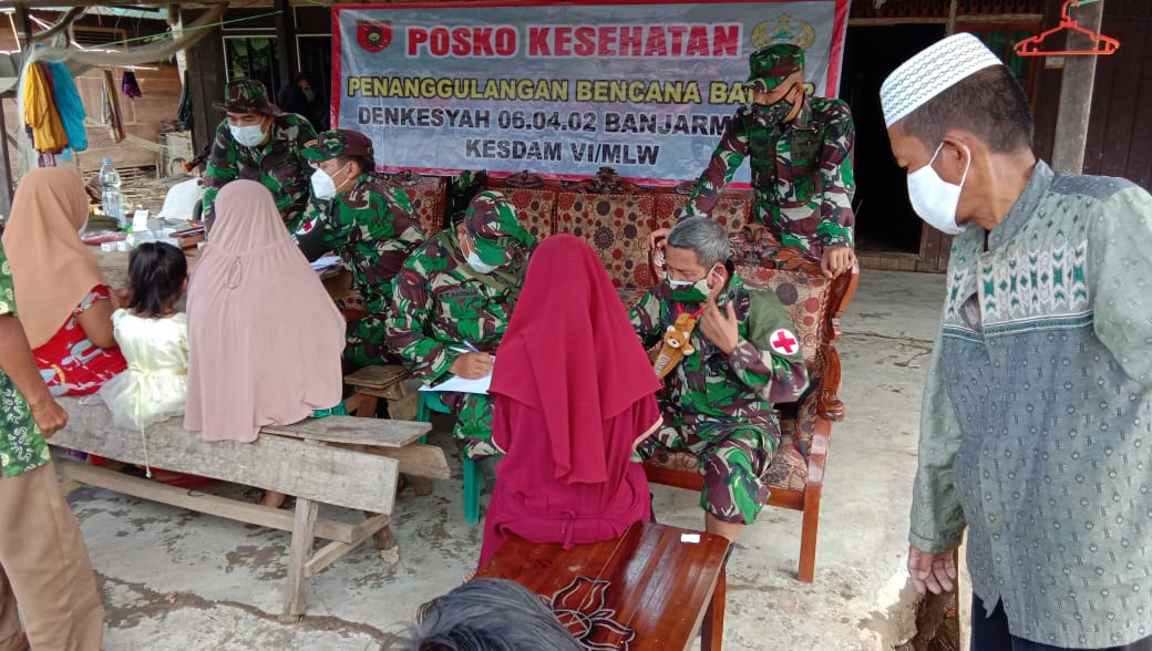 Melalui Tim Pusat Kesehatan Angkatan Darat, TNI-AD membuka posko kesehatan penanggulangan banjir di Kecamatan Pandawan Kabupaten Hulu Sungai Tengah (HST), Rabu (20/01/2021).
