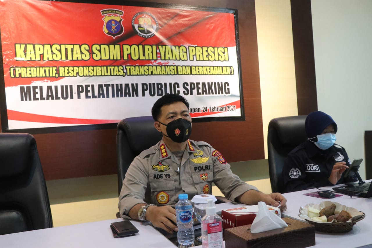 Balikpapan – Menuju Polri yang Presisi (prediktif, responsif, transparansi dan berkeadilan), Kabid Humas Polda Kaltim Kombes Pol Ade Yaya Suryana, mengikuti pelatihan public speaking secara virtual yang bertempat di ruang press release Bid Humas Polda Kaltim, Rabu (22/02/2021).