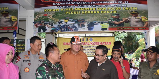 SAMARINDA, Inibalikpapan.com – Pangdam VI Mulawarman Mayjen TNI Subiyanto dan Kapolda Kaltim Irjen Pol Priyo Widyanto, meninjau langsung lokasi banjir di Samarinda, Kalimantan Timur, Jumat (14/6/2019).