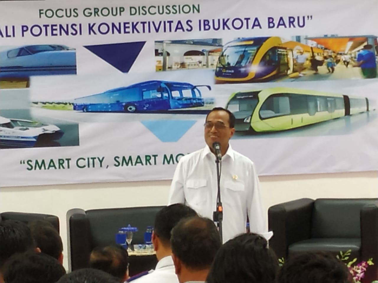 “Menhub berinisiatif bahwa bentuk kota yang berkelanjutan maka harus disediakan angkutan massal. jangan pake motor-motor. Dan angkutan massal pun menggunakan emisi ramah lingkungan,” kata Menhub dalam FGD menggali potensi konektivitas ibukota baru