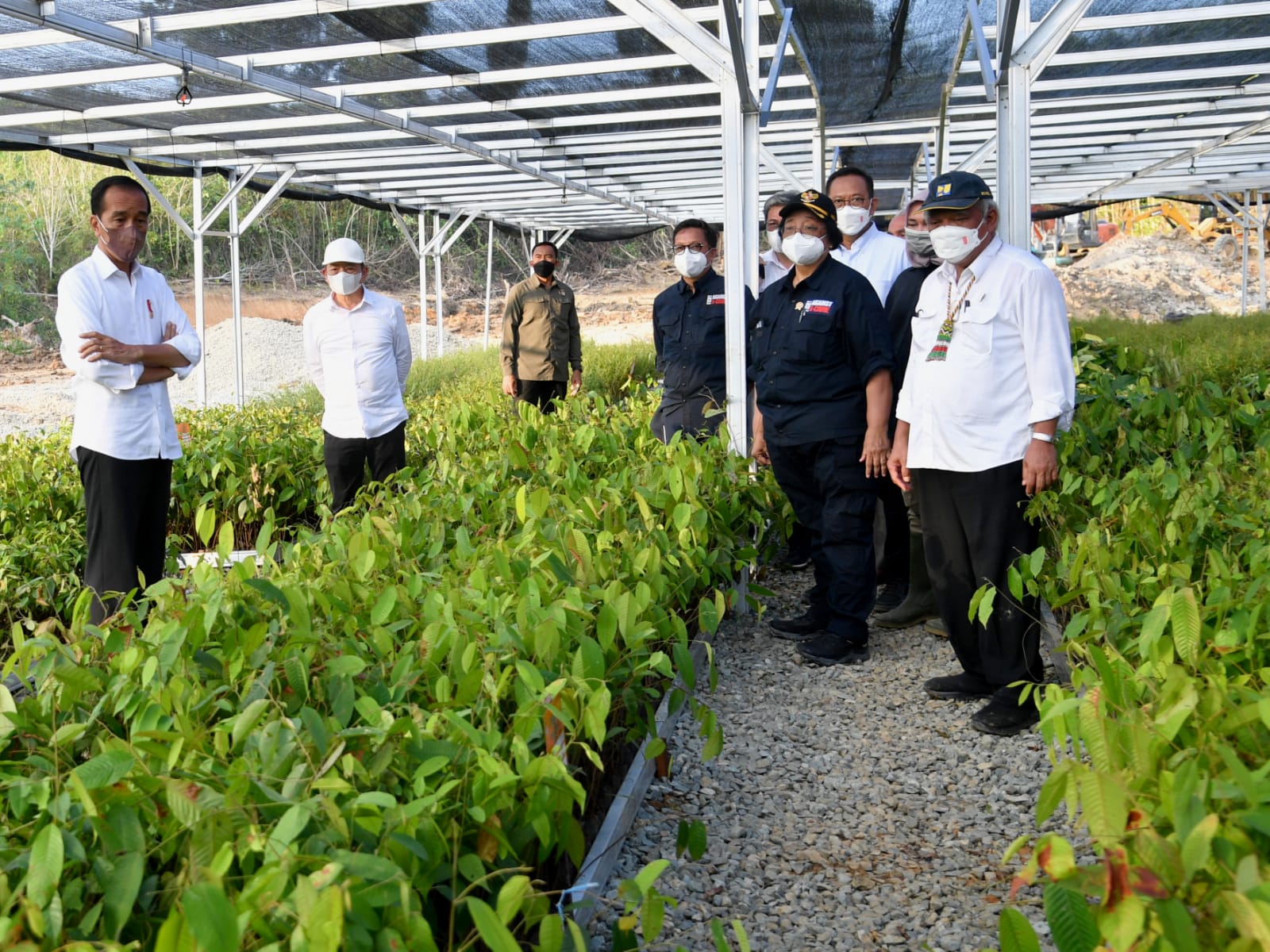 Jokowi berkeliling untuk melihat sejumlah fasilitas dan bibit pohon yang ada di lokasi persemaian. Jokowi kembali menegaskan bahwa pemerintah berkomitmen untuk mengawali pembangunan Ibu Kota Nusantara (IKN) dengan merehabilitasi hutan yang ada.