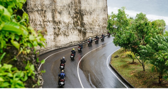 Kondisi hujan yang membuat jalan licin dan jarak pandang terbatas tentunya harus disikapi dengan cara berkendara yang bijak. Seperti jangan berkendara dengan kecepatan yang tinggi dan sering mendahului pengendara lain.