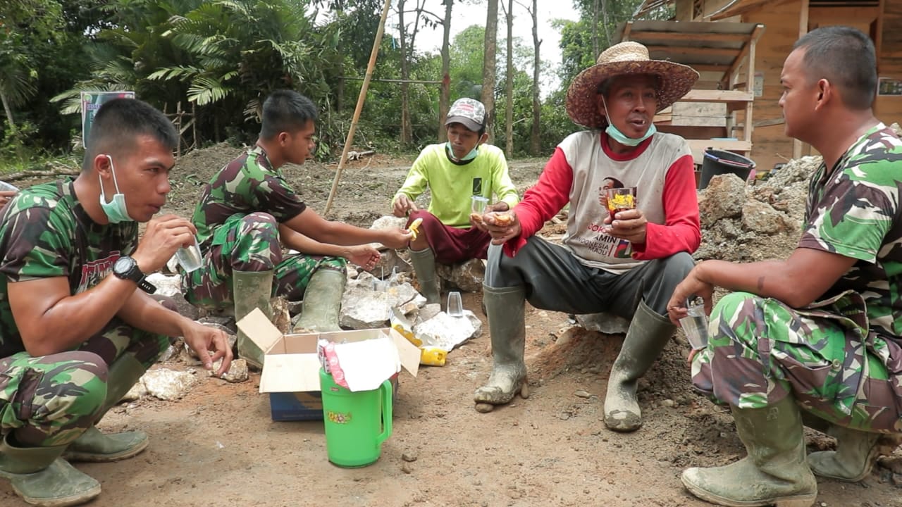 Begitu akrab dan humanis percakapan anggota TNI dengan warga masyarakat melepas lelah sambil menikamati segelas kopi dan kue extrapuding.