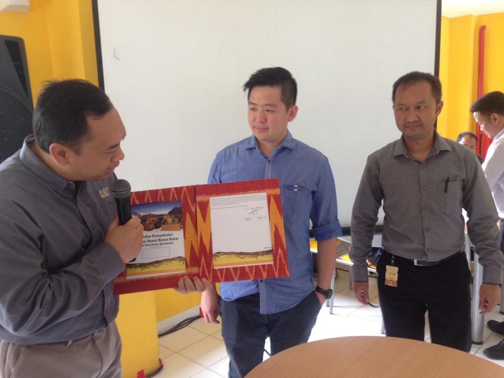 Pada kesempatan diserahkan surat lembar kesepakatan garansi hemat BBM dari Trakindo kepada Adrian salah konsumen asal Samarinda yang membeli produk Cat 320.