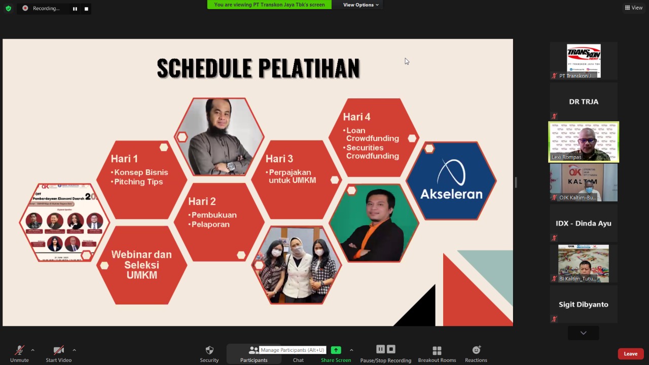 Masih di hari yang sama, materi dilanjutkan Steffy selaku Head Funding di PT Transkon Jaya Tbk yang menyampaikan materi mengenai tips dan trick pitching atau bagaimana pelaku UMKM dapat memperkenalkan serta mempresentasikan profil dan kinerja perusahaannya ke lembaga pendanaan bahkan ke investor.