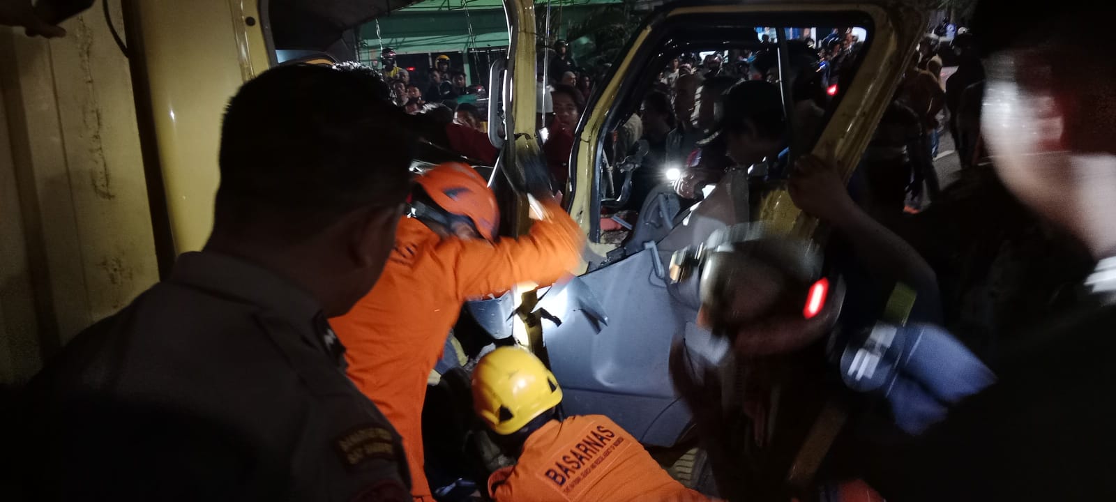 Petugas sempat melakukan pemotongan pada bagian depan dekat stir kendaraan yang menyebabkan sopir terjepit akibat benturan. Belum diketahui identitas sopir yang terjepit tersebut.