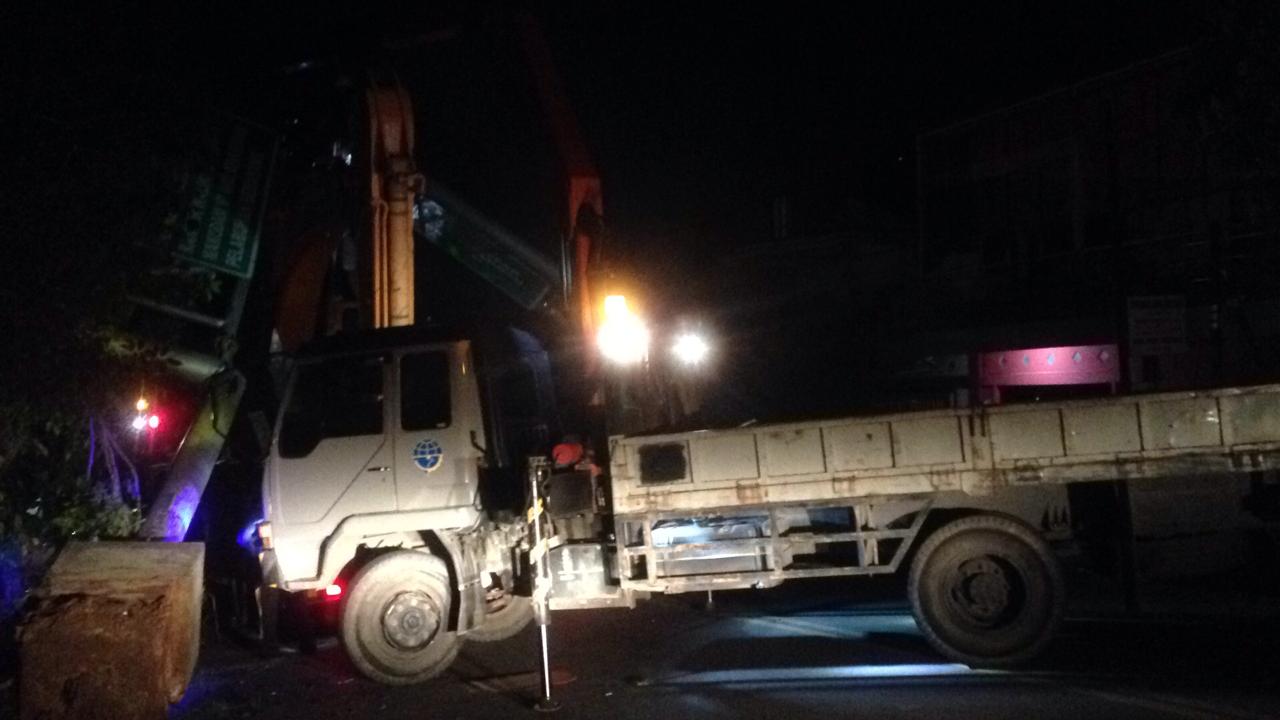 Dalam perjalanannya, belalai buket ekscavator menghatam papan nama penunjuk jalan milik Balai Pengelola Transfortasi Darat XVII Kaltim yang ada di Jalan Syarifuddin Yoes, Balikpapan Selatan.