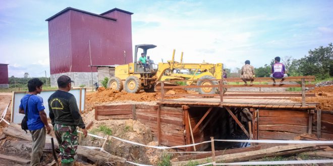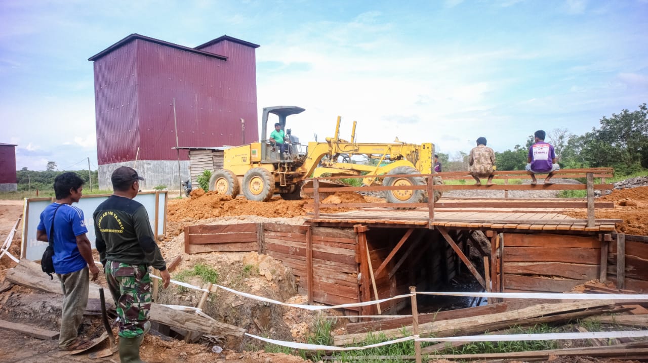 Pembangunan jembatan kayu ulin ditengah tengah pembuatan jalan itu tak lepas jadi sorotan warga, jembatan yang berbahan dasar utuh kayu ulin itu diprediksi akan selesai besok hari, parit yang bermuara di sungai yang melintasi dibawah jembatan menjadi jalan air sepanjang pembangunan jalan dan kebun masyarakat.