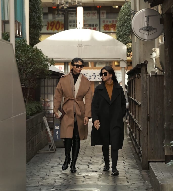Kelly Tandiono (kiri) bersama Kerenina Sunny (kanan). Menggunakan koleksi HEATTECH sebagai lapisan dalam (inner) menjadi hal wajib dilakukan saat liburan musim dingin untuk menunjang kehangatan dan kenyamanan tubuh.