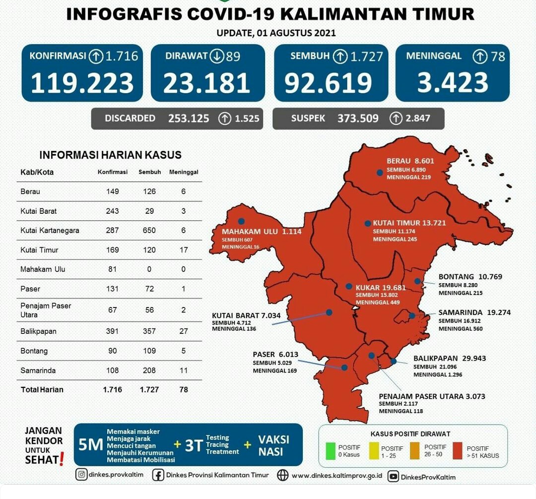 Update 1 Agustus 2021 : Bertambah 1.716 Kasus Covid-19 di Kaltim, 78 Kasus Kematian