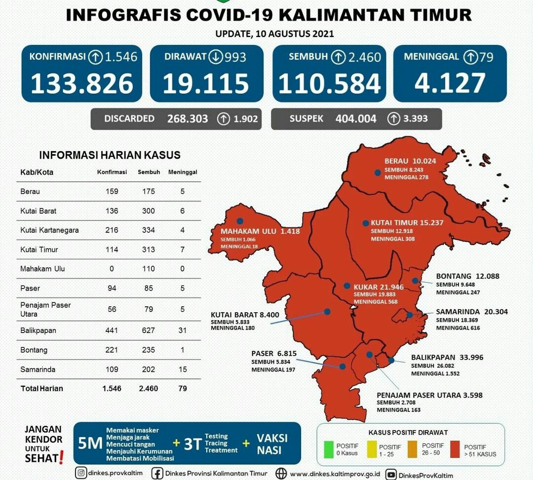 Update 10 Agustus 2021 : Bertambah 1.546 Kasus Positif Covid-19 di Kaltim, Balikpapan Masih Penyumbang Kasus Tertinggi