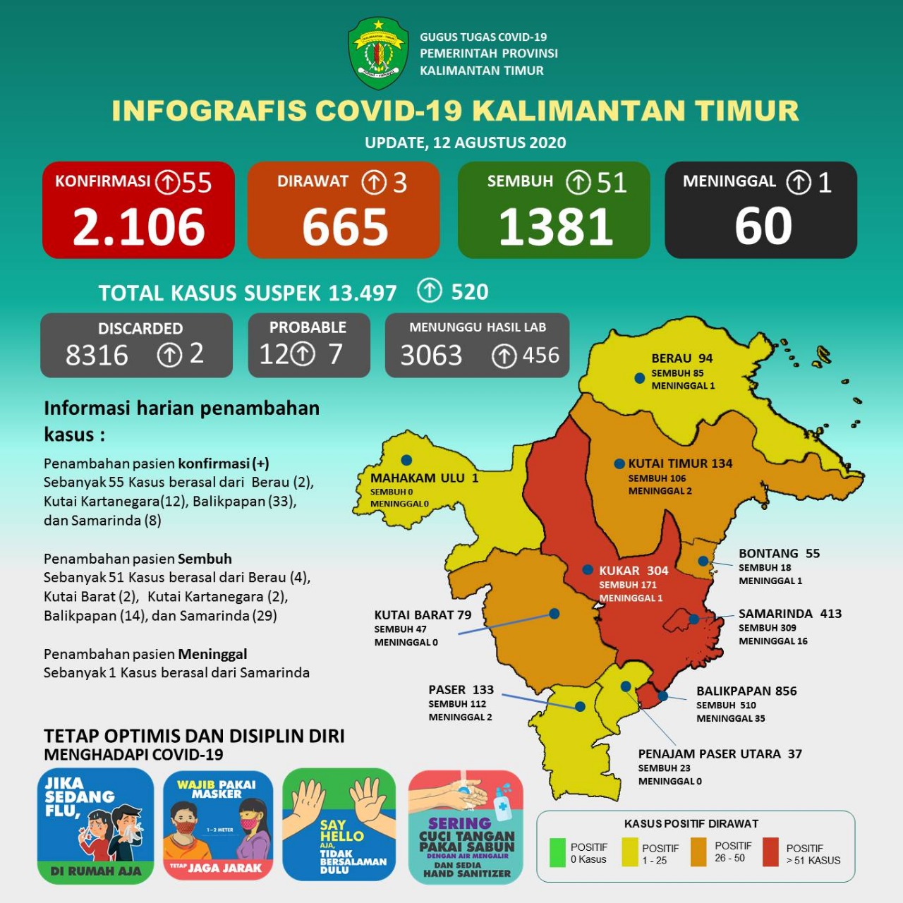 Update 12 Agustus 2020 : Bertambah 55 Kasus Positif Covid-19 di Kaltim, 51 Kasus Sembuh