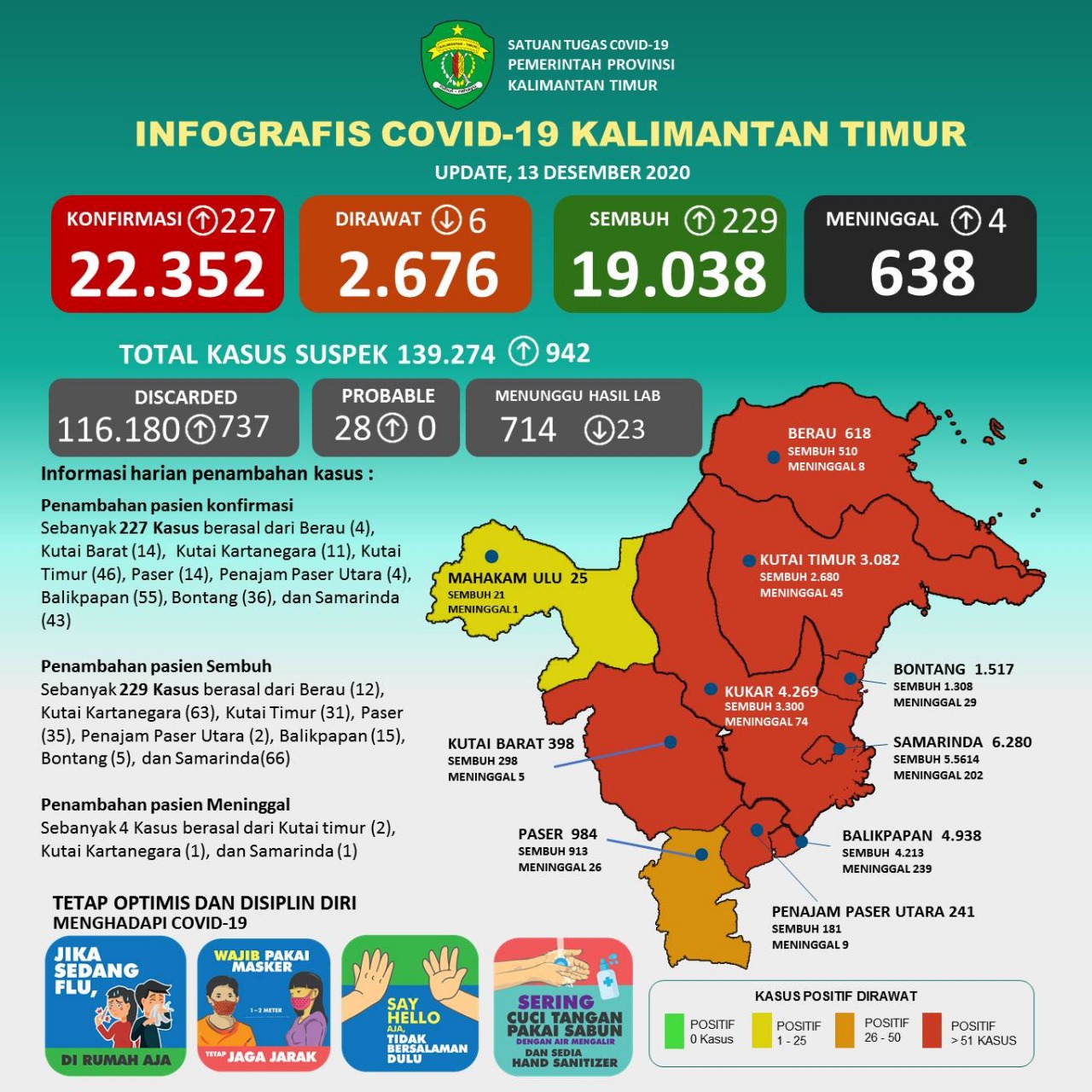Update 13 Desember 2020 : Bertambah 227 Kasus Positif Covid-19 di Kaltim, 4 Kasus Kematian