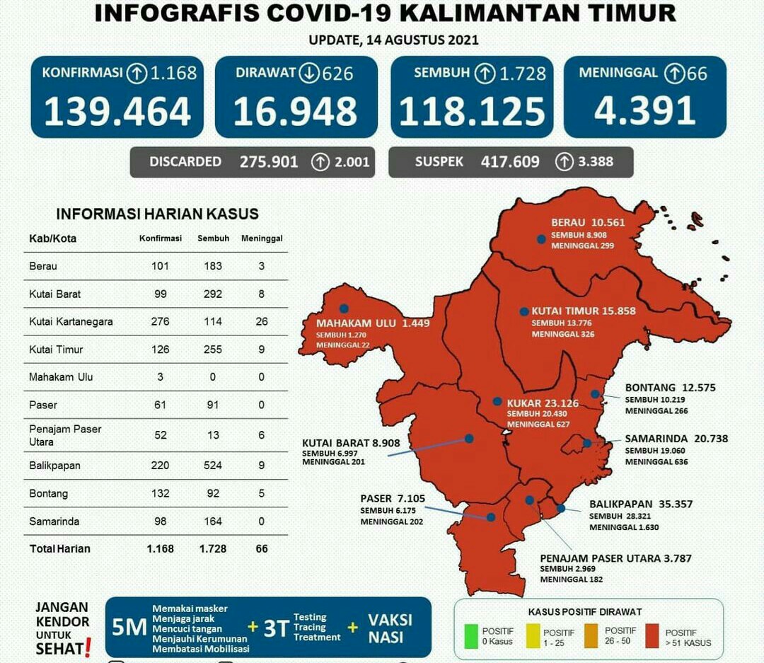 Update 14 Agustus 2021 : Bertambah 1.168 Kasus Covid-19 di Kaltim, 66 Kasus Kematian
