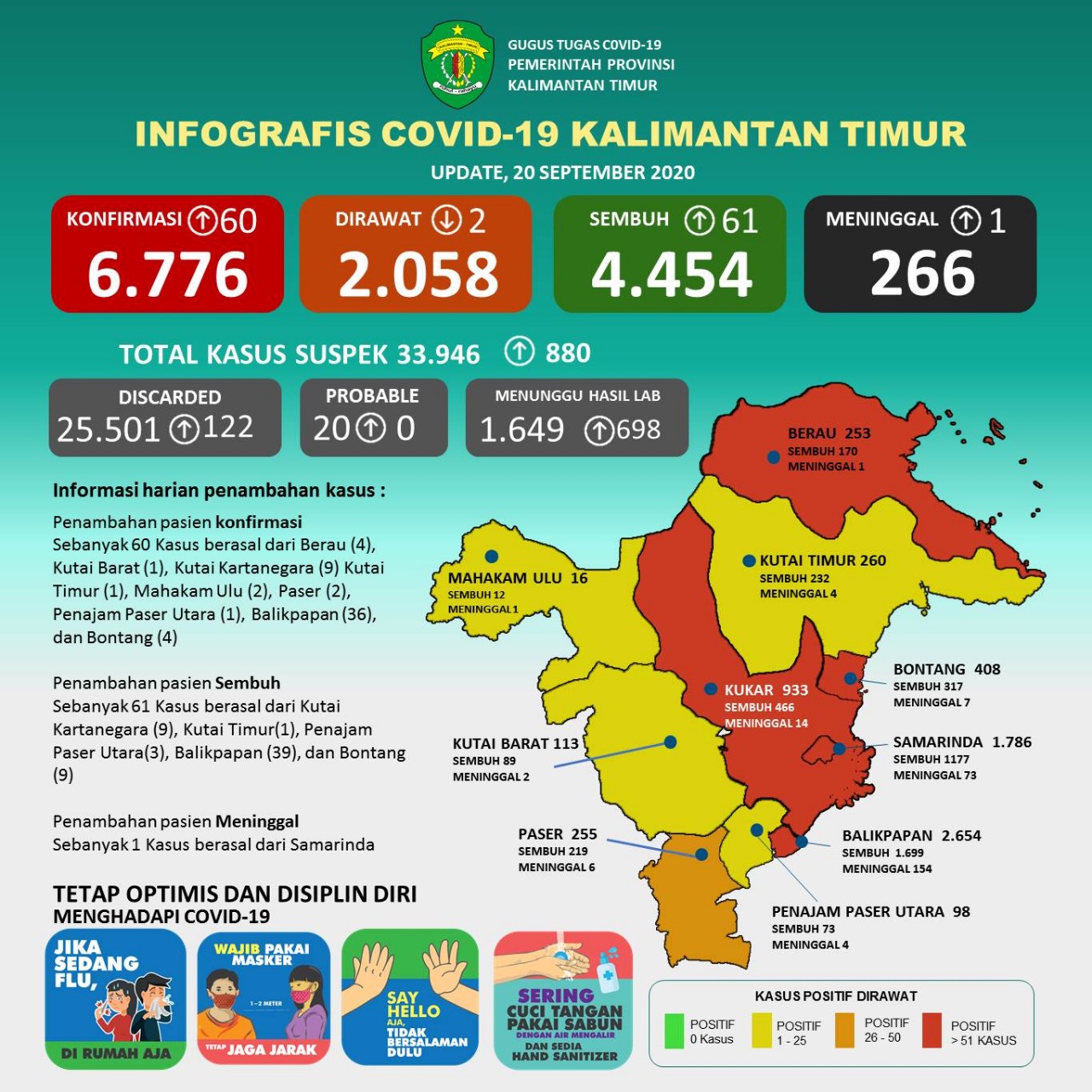 Update 20 September 2020 ; Bertambah 60 Kasus Positif Covid-19 di Kaltim, 61 Pasien Sembuh