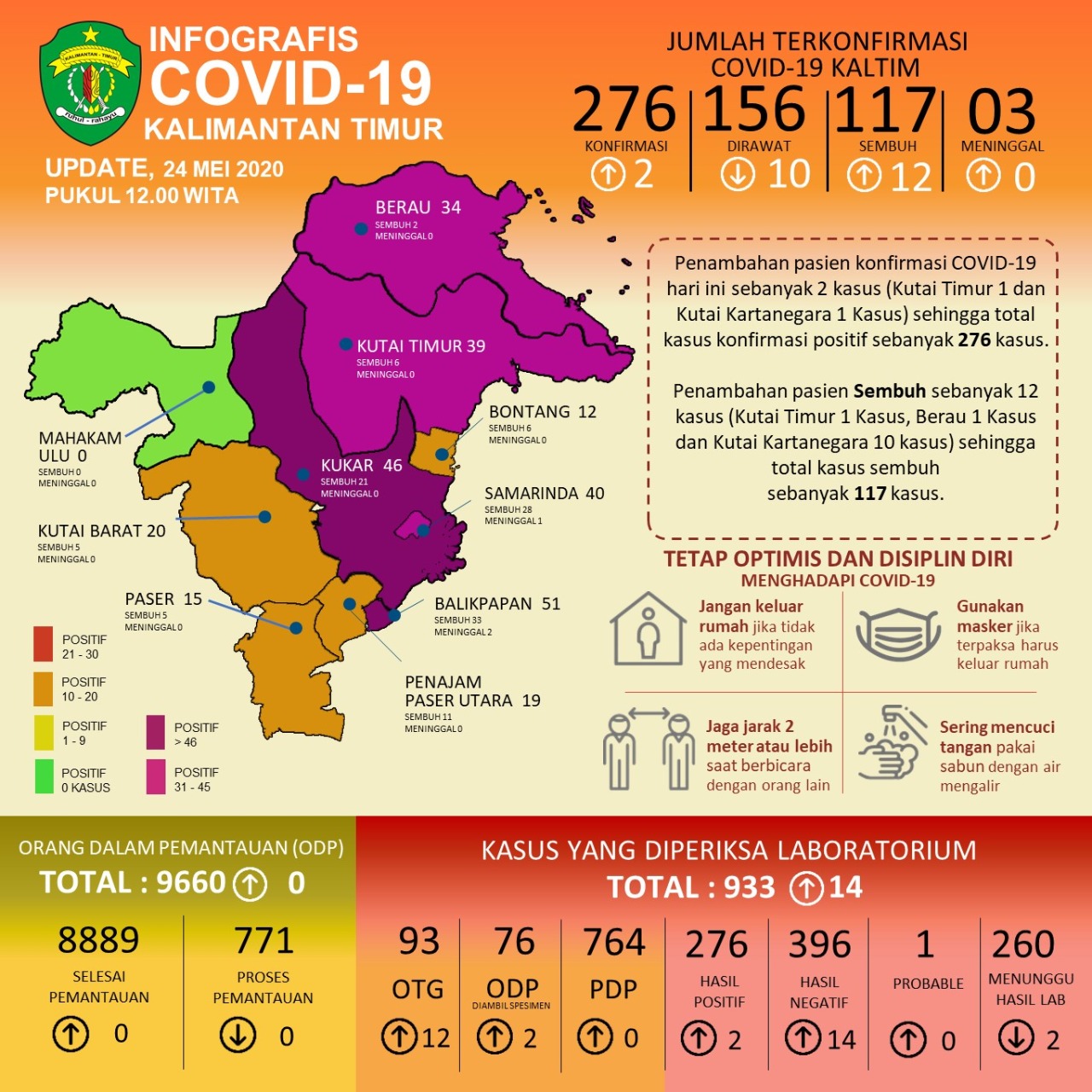 Sementara kabar baiknya, ada penambahan 12 kasus sembuh, yakni 1 kasus dari Kabupaten Berau, 1 kasus dari Kabupaten Kutai Timur dan 1 kasus dari Kabupaten Kutai Kertanegera