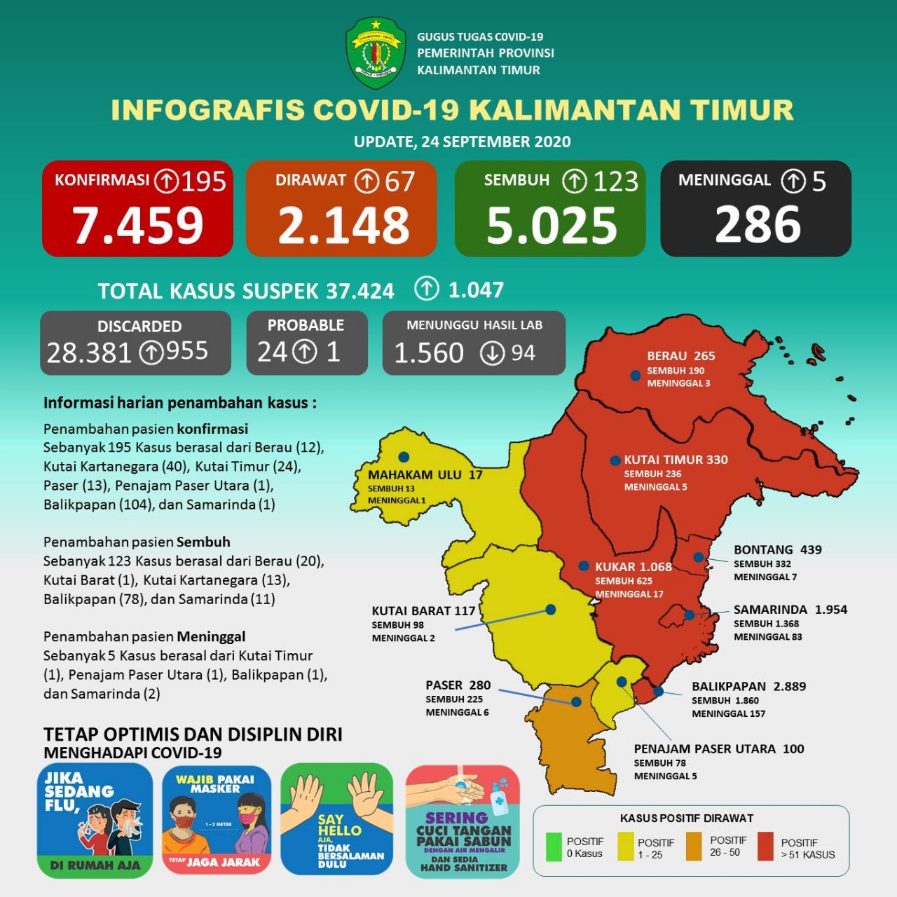 Update 24 September 2020 : Bertambah 195 Kasus Positif Covid-19 di Kaltim, Sembuh 123 Pasien