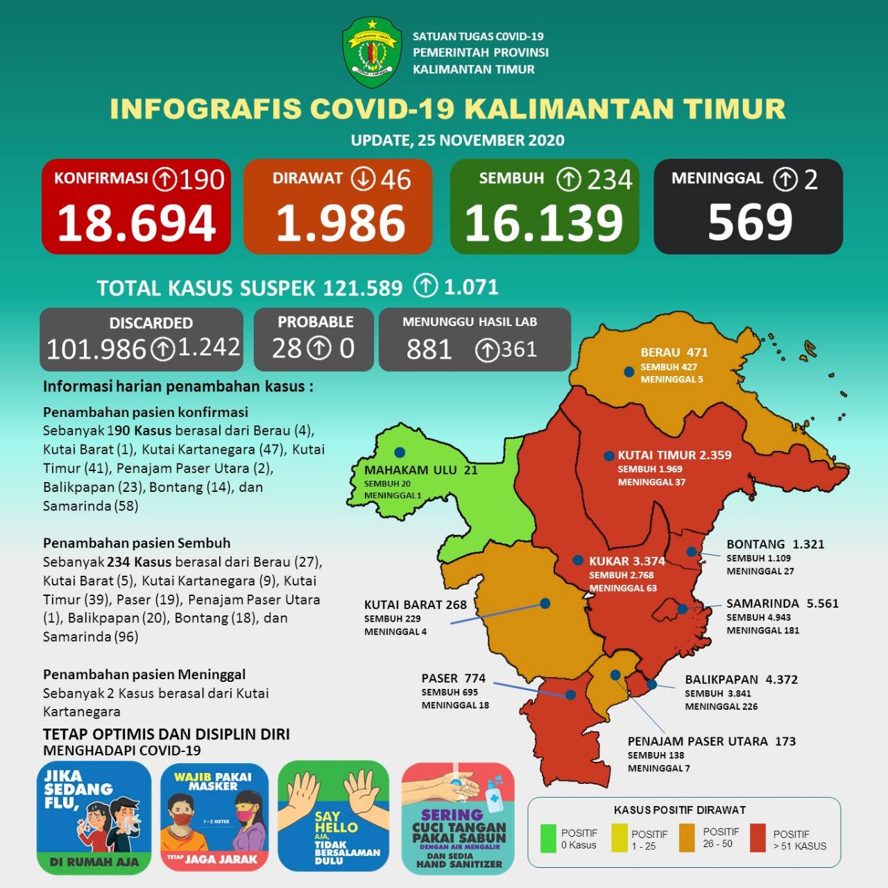 Update 25 November 2020 : Bertambah 190 Kasus Positif Covid-19 di Kaltim, 2 Kasus kematian