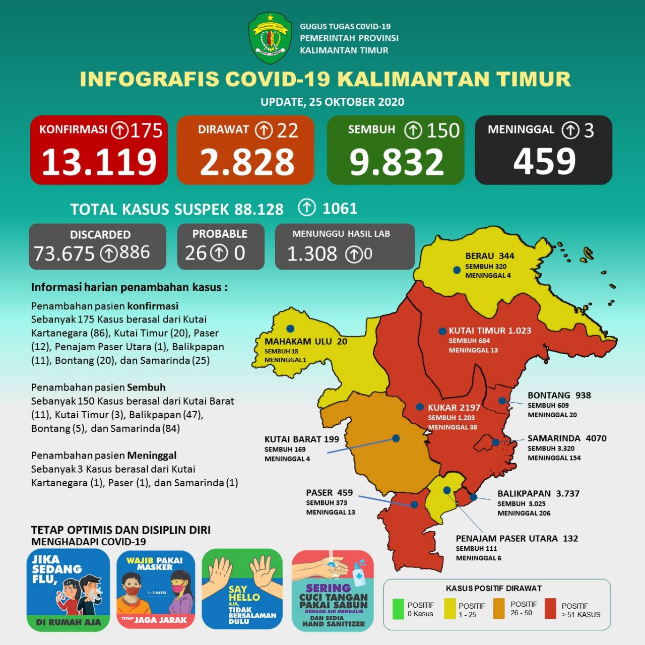 Update 25 Oktober 2020 : Bertambah 175 Kasus Positif Covbid-19 di Kaltim, 3 Kasus Kematian