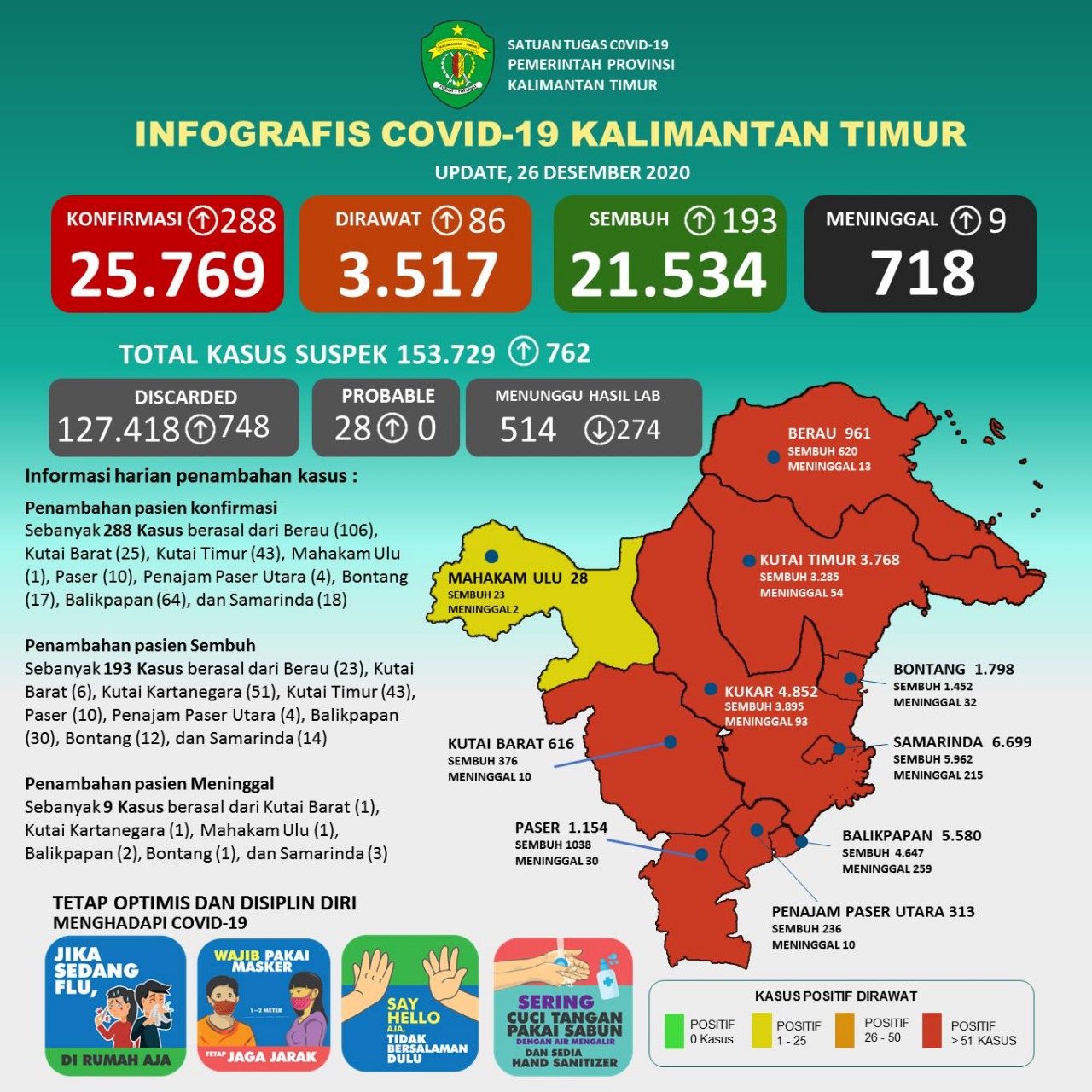 Update 26 Desember 2020 : Bertambah 288 Kasus Positif Covid-19 di Kaltim, 9 Kasus Kematian