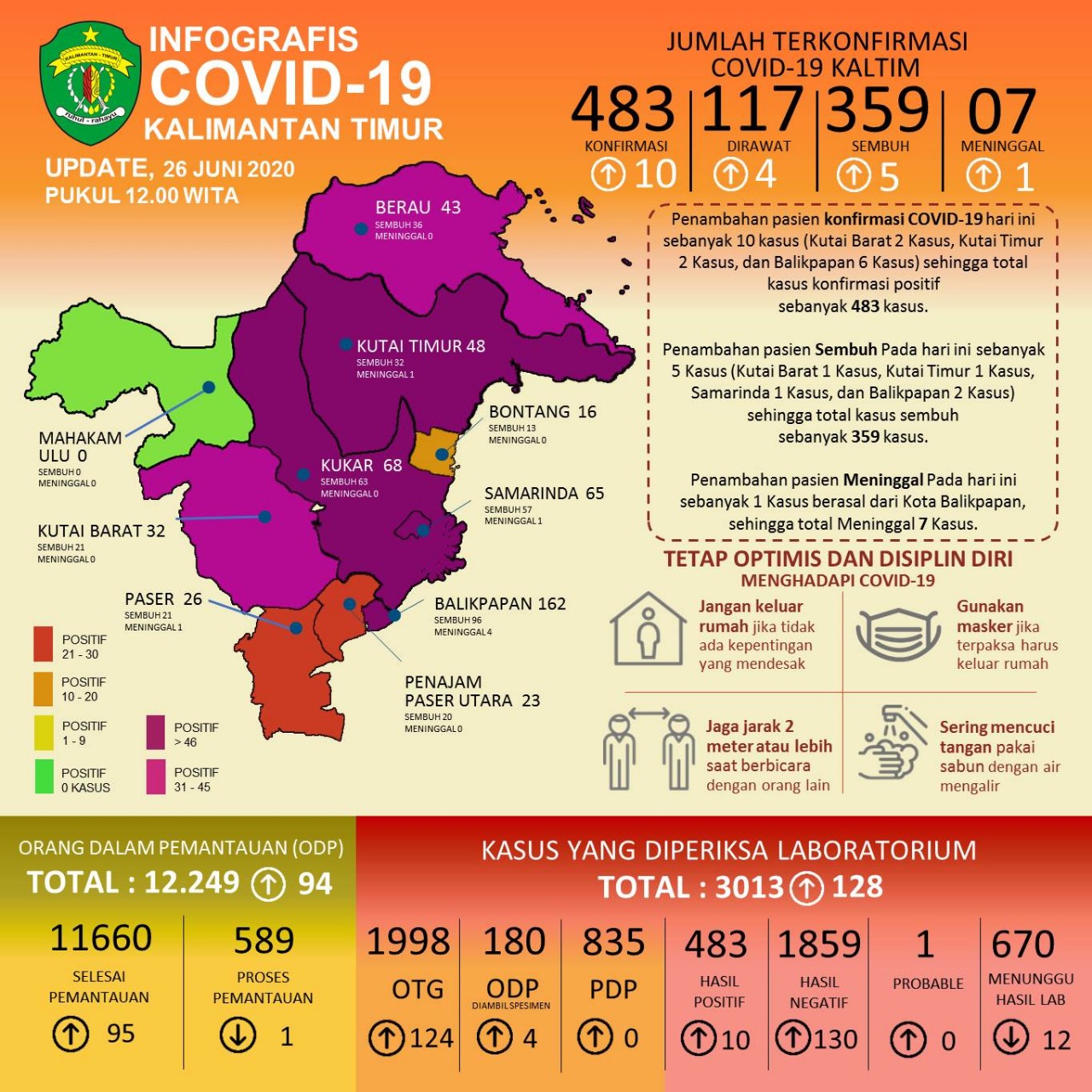 Hingga Jumat (26/06), jumlah kasus covid-19 di Kaltim berjumlah 483 kasus, yang masih dirawat 117 kasus, sembuh 359 kasus dan meninggal 7 kasus.