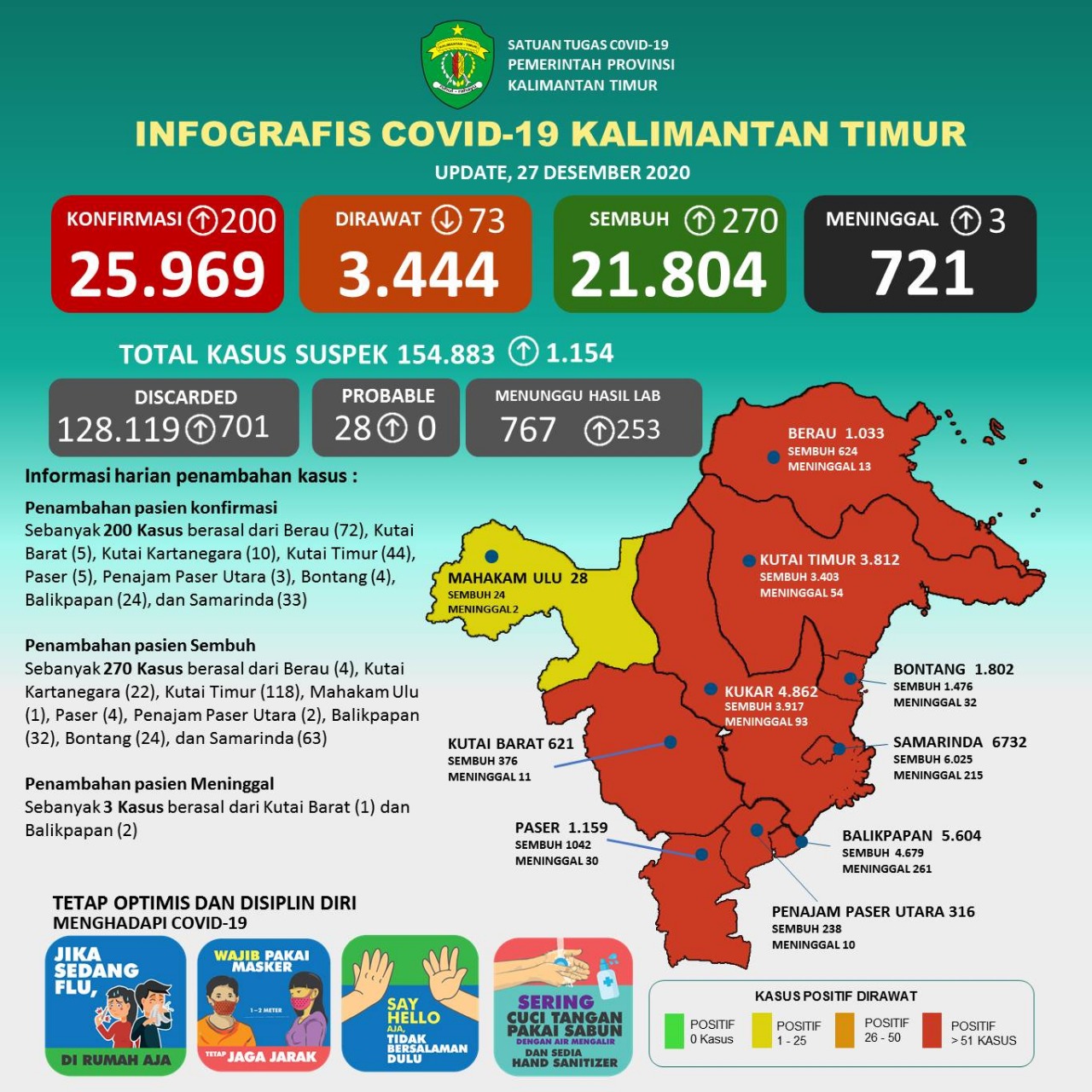 Update 27 Desember 2020 : Bertambah 200 Kasus Covid-19 di Kaltim, 270 Pasien Sembuh
