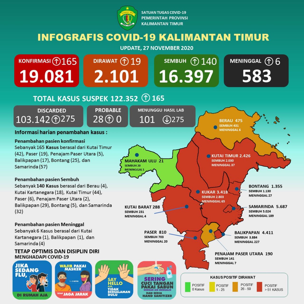 Update 27 November 2020 : Bertambah 165 Kasus Positif Covid-19 di Kaltim, 7 Kasus Kematian