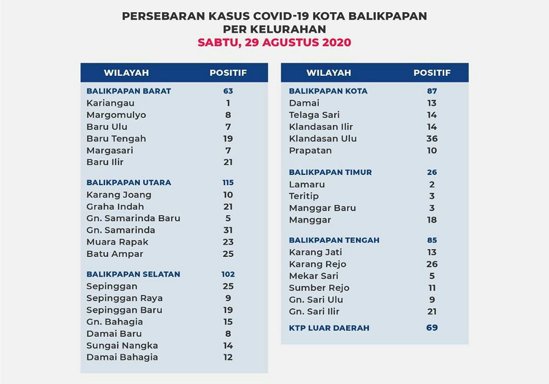 Update 29 Agustus 2020 : Bertambah 61 Kasus Positif Covid-19 di Balikpapan, 7 Kasus Meninggal