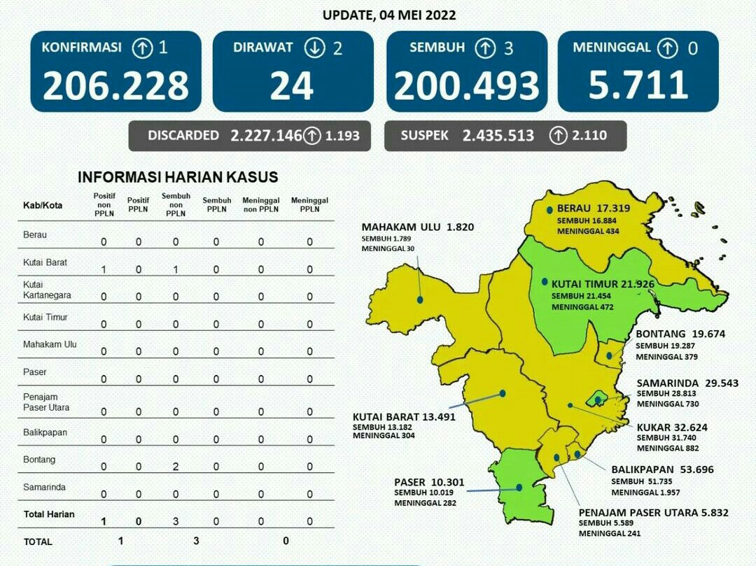 Update 4 Mei 2022 : Bertambah 1 Kasus Covid-19 di Kaltim, Nol Kasus Kematian