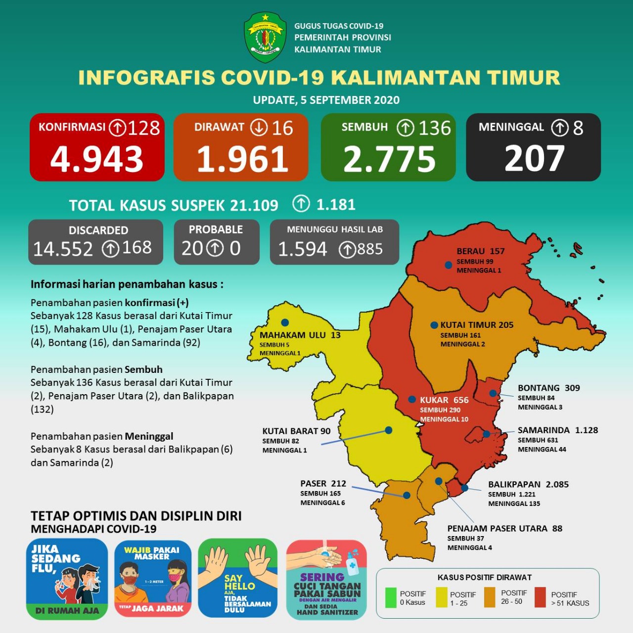 Update 5 September 2020 : Bertambah 128 Kasus Positif Covid-19 di Kaltim, Sembuh 136 Kasus