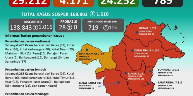 Update 7 Januari 2021 : Melonjak 479 Kasus Positif Covid-19 di Kaltim, Tembus 29.212 Kasus